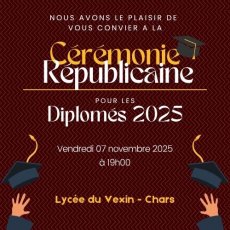 Nous avons le plaisir de vous convier à la Cérémonie Républicaine de remise de votre diplôme (DNB, CAP, Bac Pro ou BTS) obtenu lors de la session 2025.